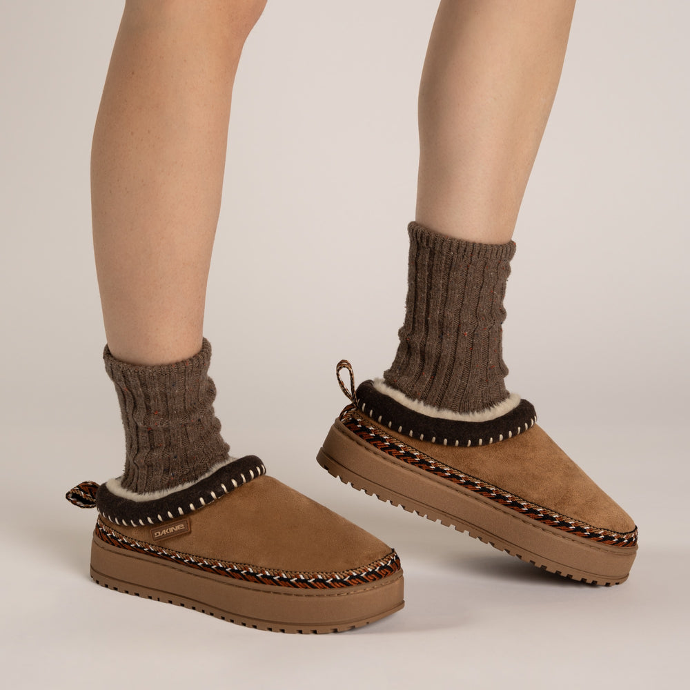 The wait is over—meet the highly anticipated Topanga. This women’s clog slipper combines elevated style with everyday comfort, earning its place as a new winter classic. A smooth micro-suede upper is complemented by a cozy felt collar and durable tape mudguard. Inside, plush faux baby shearling delivers luxurious warmth, while the platform TPR outsole adds a modern lift with reliable traction indoors and out.