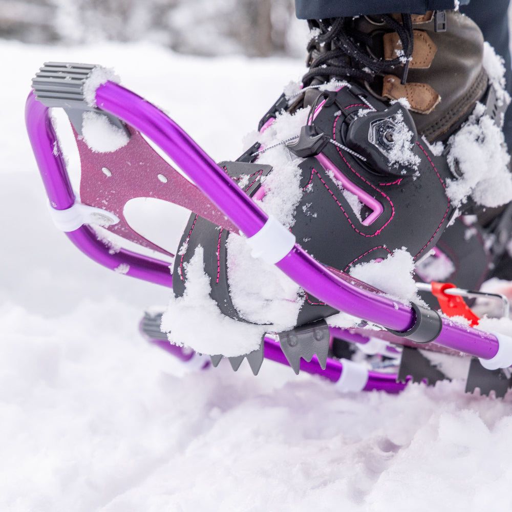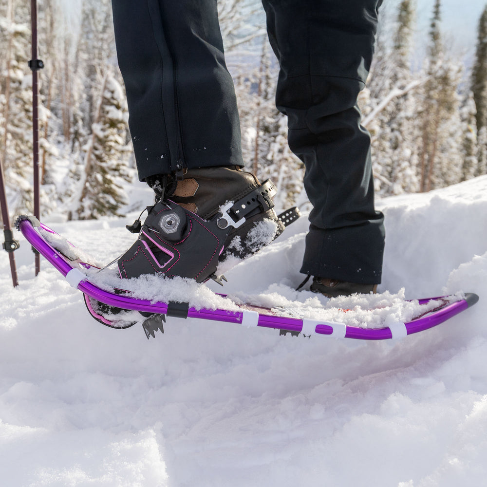 Our Women's back country level snowshoe. Light-weight 6000-grade anodized-aluminum frame with durable HDPE decking and premium deck clips for added traction. Easy to put on/take off with our Northwave Spin bindings that allow for easy adjustment. Hardened steel crampons for excellent traction on icy terrain. Comes with a heel lift feature to reduce calf fatigue on steep ascents. Designed with a unique rockered frame for a natural stride and to distribute weight effectively to prevent sinking into soft snow. Comes with adjustable carbon trekking poles, with molded EVA extended grips and aluminum Fast-Lock Adjustment system, snow and trekking baskets and a carry bag for easy transport and storage.